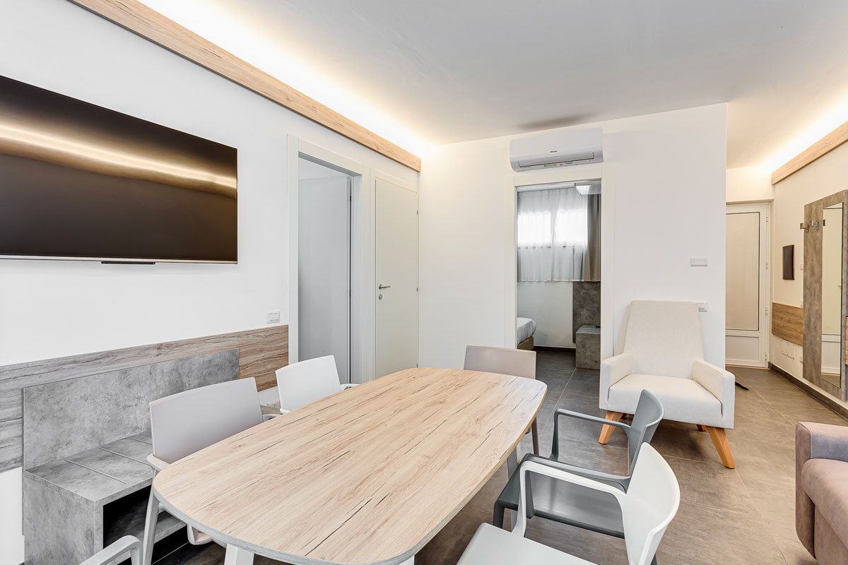 Appartamento composto da una camera matrimoniale e un soggiorno con angolo cottura e divano letto matrimoniale. L’appartamento è dotato di frigorifero a colonna (con freezer), lavastoviglie, lavatrice, un bagno con doccia e un balcone, con affaccio sul cortile interno del Residence. Ogni ambiente dispone di aria condizionata/riscaldamento e TV.