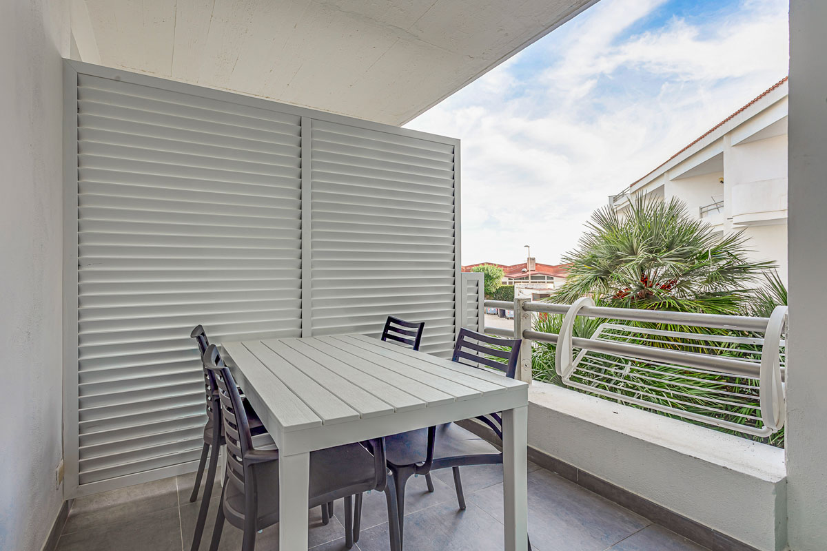 Appartamento composto da una camera matrimoniale, una camera doppia o matrimoniale e un soggiorno con angolo cottura e divano-letto singolo. L’appartamento è dotato di frigorifero a colonna (con freezer), lavastoviglie, lavatrice, un bagno con doccia e un ampio balcone, con affaccio sul cortile interno del Residence.